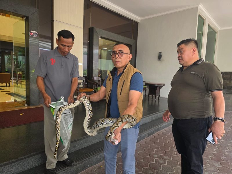Setelah berhasil dilumpuhkan dengan tangan kosong, ular sanca itu segera diserahkan kepada pihak keamanan hotel untuk dievakuasi dari area publik.